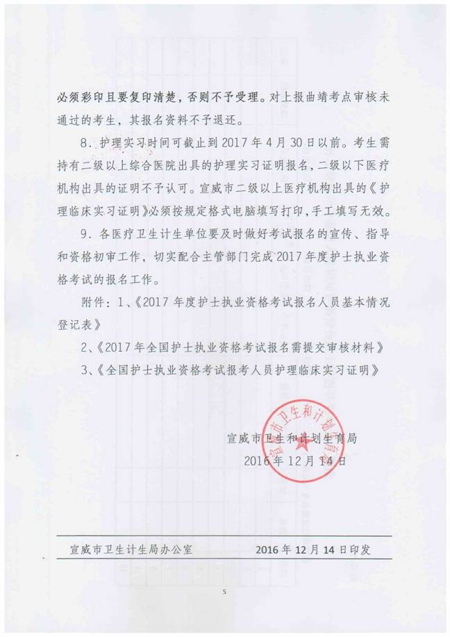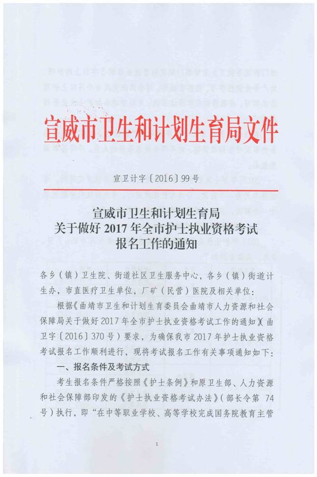 宣威市衛(wèi)生計(jì)生局現(xiàn)場(chǎng)審核時(shí)間為2016年12月19日-2017年1月5日。請(qǐng)各醫(yī)療衛(wèi)生計(jì)生單位及時(shí)通知護(hù)理人員報(bào)名并進(jìn)行現(xiàn)場(chǎng)審核,逾期將不再審核確認(rèn),導(dǎo)致無法參加考試的責(zé)任自負(fù)。