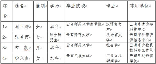 按照《云南省科學(xué)技術(shù)協(xié)會(huì)2016年事業(yè)單位公開招聘工作人員公告》,經(jīng)過筆試、面試、考核、體檢,現(xiàn)對(duì)周小婷等4名擬聘用人員進(jìn)行公示。對(duì)擬聘用人員如有異議,請(qǐng)向省科協(xié)機(jī)關(guān)紀(jì)委反映。