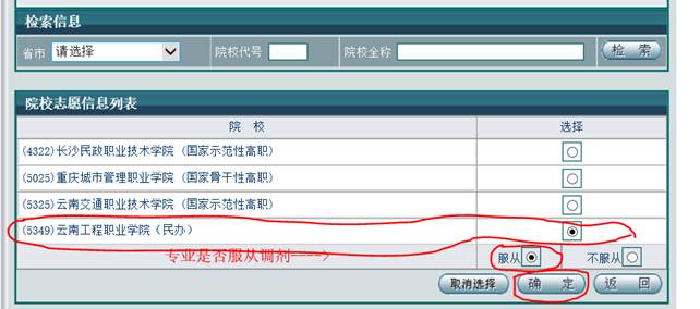 功能后,選擇專業(yè)“服從” 調(diào)劑,然后點(diǎn)擊“確定”