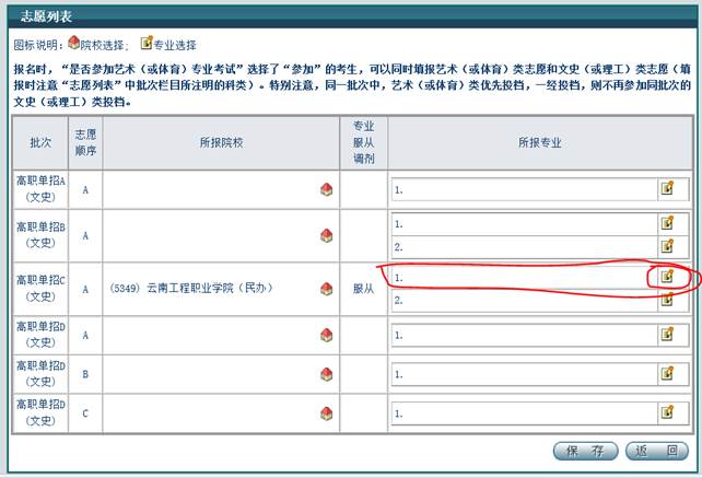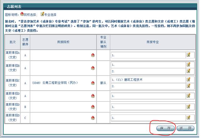 最后一步,點(diǎn)擊“保存”,然后點(diǎn)擊“返回”。最后,到報(bào)考確認(rèn)點(diǎn)進(jìn)行交費(fèi)、確認(rèn)志愿后,方生效。
