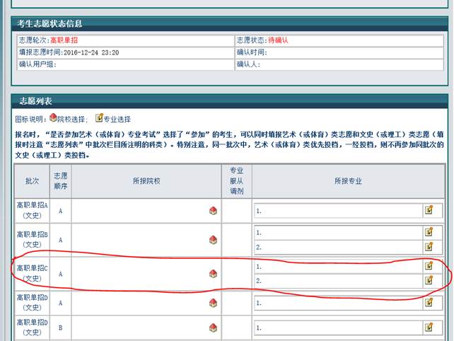 第五步,在“志愿列表”中選擇“高職單招C”類,點(diǎn)擊“”功能后,選擇學(xué)校