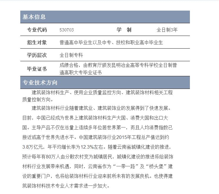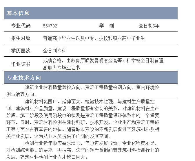 建筑材料工程技術(原無機非金屬材料工程技術)專業(yè)始建于1979年,至今有37年的辦學歷史。該專業(yè)是我校國家示范院校建設項目四個重點建設專業(yè)之一,是云南省重點建設專業(yè),云南省特色專業(yè)。