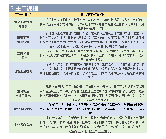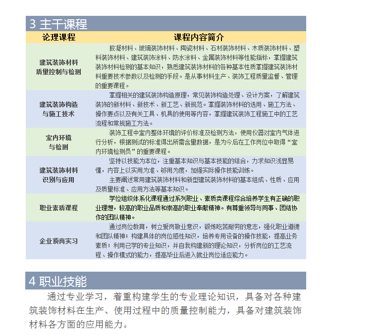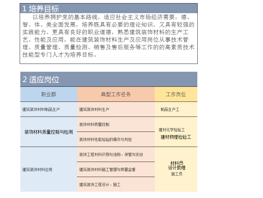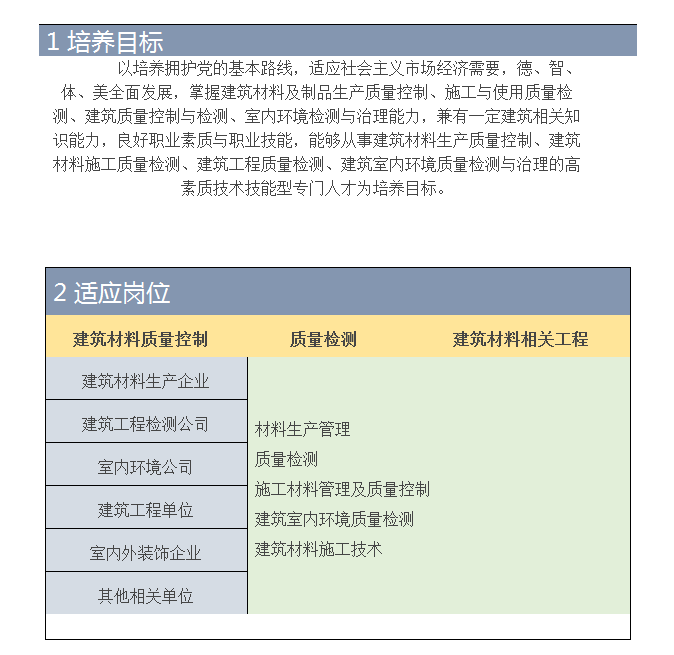 建筑材料工程技術專業(yè)培養(yǎng)具有必要理論知識、較強實踐能力、良好職業(yè)道德,能在建筑材料生產(chǎn)、應用領域從事中央控制、生產(chǎn)設備巡檢、材料質(zhì)量控制和檢測以及設備改造、生產(chǎn)管理等工作的技術技能型人才。
