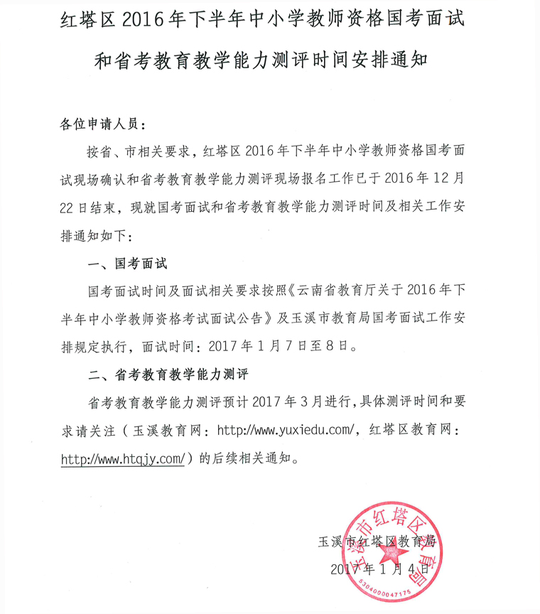 紅塔區(qū)2016年下半年中小學(xué)教師資格國考面試和省考測評時間通知