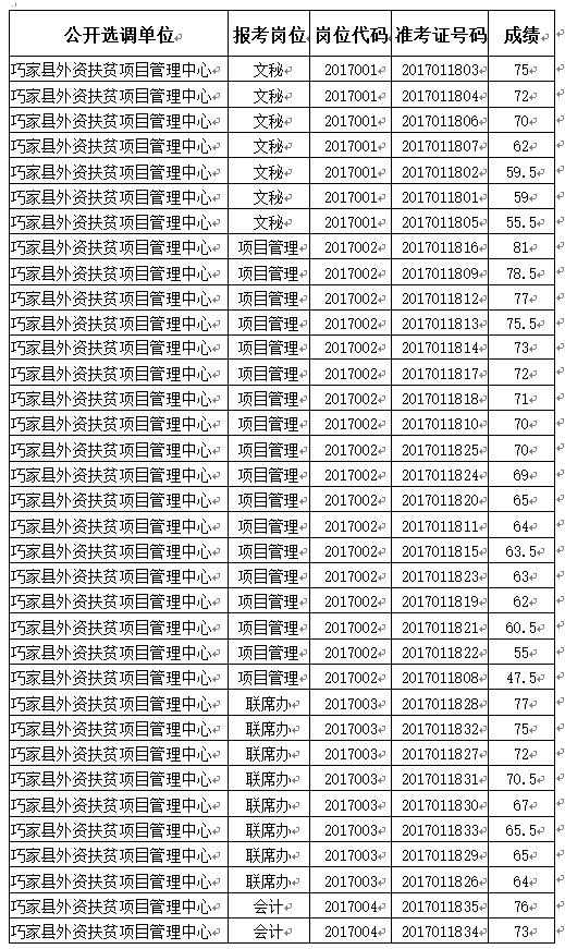 一、 巧家縣扶貧辦2017年公開選調(diào)工作人員筆試成績(jī)