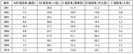 108.2001-2010年各級(jí)別轎車歷年銷售份額的變化趨勢(shì)正確的是: