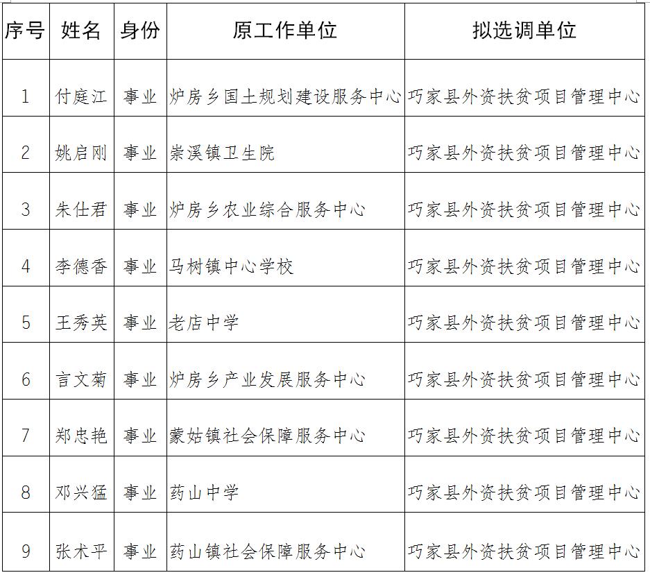 根據(jù)《巧家縣人力資源和社會保障局 巧家縣扶貧辦2017年公開選調(diào)工作人員公告》(第一號),經(jīng)報名與資格審查、筆試、面試、考察與業(yè)績評價等程序,確定付庭江等9名同志為擬選調(diào)人員: