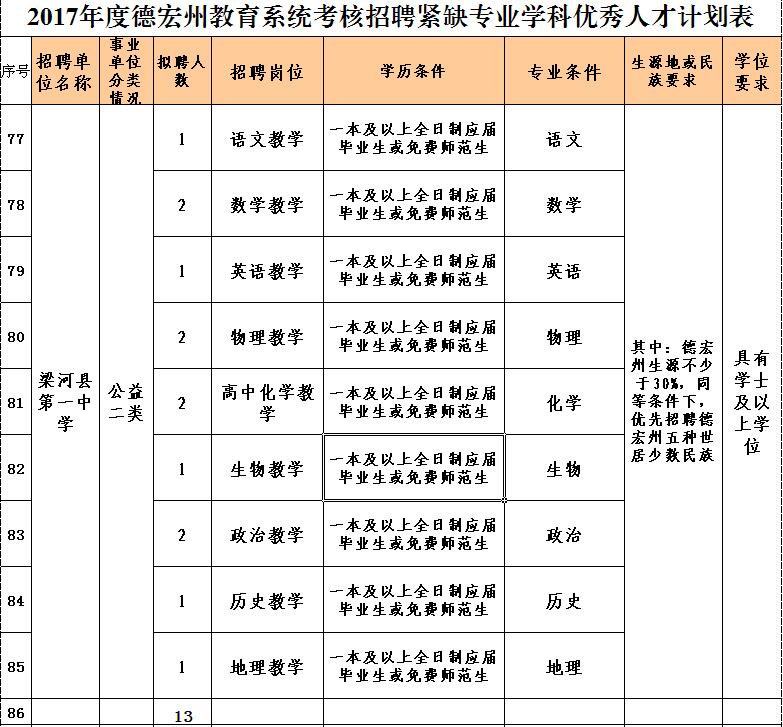 2017年梁河縣第一中學(xué)擬招騁緊缺專業(yè)學(xué)科優(yōu)秀教師13人,具體要求見(jiàn)下表: