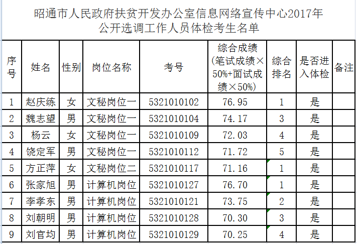 昭通市扶貧辦信息網(wǎng)絡宣傳中心2017年公開選調(diào)工作人員通過筆試、面試、考察等程序,已進入體檢階段,現(xiàn)將體檢相關工作及體檢人員名單通告如下: