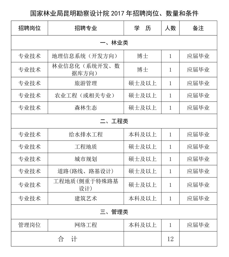 根據(jù)《國家林業(yè)局人事司關(guān)于下達2017年直屬單位接收高校畢業(yè)生計劃的函》相關(guān)要求,我院2017年面向應(yīng)屆高校畢業(yè)生公開招聘事業(yè)崗位人員調(diào)整為12名,招聘崗位、數(shù)量和條件詳見附表。報名截止時間:2017年3月10日不變。報名方式等具體要求可在我院官網(wǎng)查看《國家林業(yè)局昆明勘察設(shè)計院2017年公開招聘工作人員公告》。