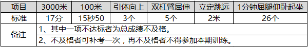 根據(jù)民航局要求,男生在取得安全員執(zhí)照前須參加民航局組織的安全員初始訓(xùn)練考核,體能考核項(xiàng)目及標(biāo)準(zhǔn)為: