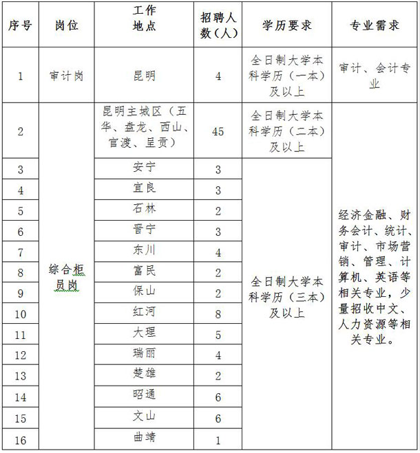 3.具有良好的英語(yǔ)聽(tīng)說(shuō)讀寫(xiě)能力,除報(bào)考昆明郊縣、州市綜合柜員崗的其余崗位在簡(jiǎn)歷投遞截止前,大學(xué)本科畢業(yè)生須通過(guò)國(guó)家大學(xué)英語(yǔ)四級(jí)(CET4)考試(成績(jī)?cè)?25分及以上);碩士研究生及以上學(xué)歷畢業(yè)生須通過(guò)國(guó)家大學(xué)英語(yǔ)六級(jí)(CET6)考試(成績(jī)?cè)?25分及以上);境外院校畢業(yè)生須提供英語(yǔ)能力資格證明(如新托福(TOEFL-iBT)考試75分及以上、雅思(IELTS)考試5.5分及以上);主修語(yǔ)種為其他外語(yǔ),通過(guò)相應(yīng)外語(yǔ)水平考試的,可適當(dāng)放寬上述英語(yǔ)要求。