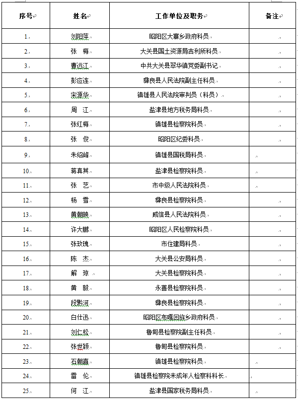 昭通市紀委監(jiān)察局公開遴選科級 及以下干部筆試人員名單公告 按照市紀委監(jiān)察局公開遴選科級及以下干部工作程序,經(jīng)報名及資格審查,現(xiàn)將符合參加筆試的人員名單予以公告。 市紀委監(jiān)察局公開遴選科級及以下干部筆試人員名單