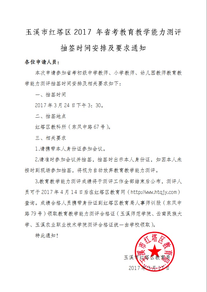 玉溪市紅塔區(qū)2017年省考教育教學(xué) 能力測評抽簽時間安排及要求通知
