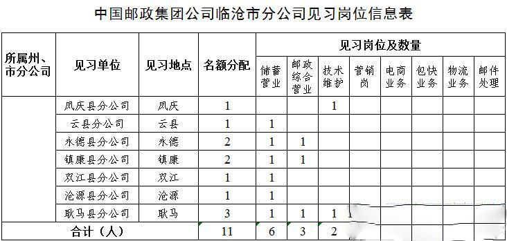 根據(jù)云南省人力資源和社會(huì)保障廳關(guān)于印發(fā)《云南省高校畢業(yè)生見習(xí)工作實(shí)施意見的通知》(云人社發(fā)〔2009〕132號)精神,為幫助高校畢業(yè)生通過就業(yè)見習(xí)升華理論知識(shí)、增長實(shí)踐技能、提升就業(yè)能力、盡快實(shí)現(xiàn)就業(yè),中國郵政集團(tuán)公司臨滄市分公司現(xiàn)面向社會(huì)提供11個(gè)見習(xí)崗位,現(xiàn)將見習(xí)崗位信息公告如下:
