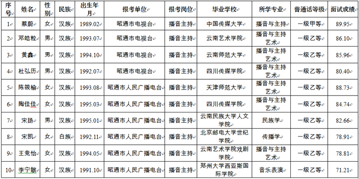 根據《昭通市新聞出版廣電系統事業(yè)單位2017年公開招聘優(yōu)秀緊缺專業(yè)技術人才通告》、《昭通市新聞出版廣電系統事業(yè)單位2017年公開招聘優(yōu)秀緊缺專業(yè)技術人才工作實施方案》及有關規(guī)定和要求,昭通市新聞出版廣電系統事業(yè)單位2017年公開招聘優(yōu)秀緊缺專業(yè)技術人才面試工作已于3月31日結束?,F將面試人員成績公示如下: