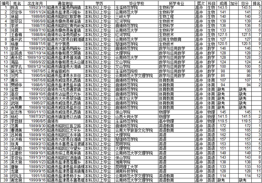 昭通市鹽津縣2013年的招聘補員教師總成績公示
