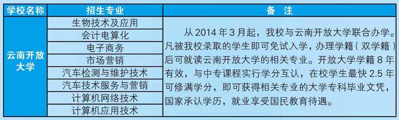 2、云南開(kāi)放大學(xué):凡欲報(bào)讀開(kāi)放大學(xué)的學(xué)生,必須先注冊(cè)為我校的中職學(xué)籍,方可取得云南開(kāi)放大學(xué)學(xué)籍。就讀開(kāi)放大學(xué)的專業(yè)需要與我校中職就讀專業(yè)相同或相近,不得跨專業(yè)報(bào)讀。