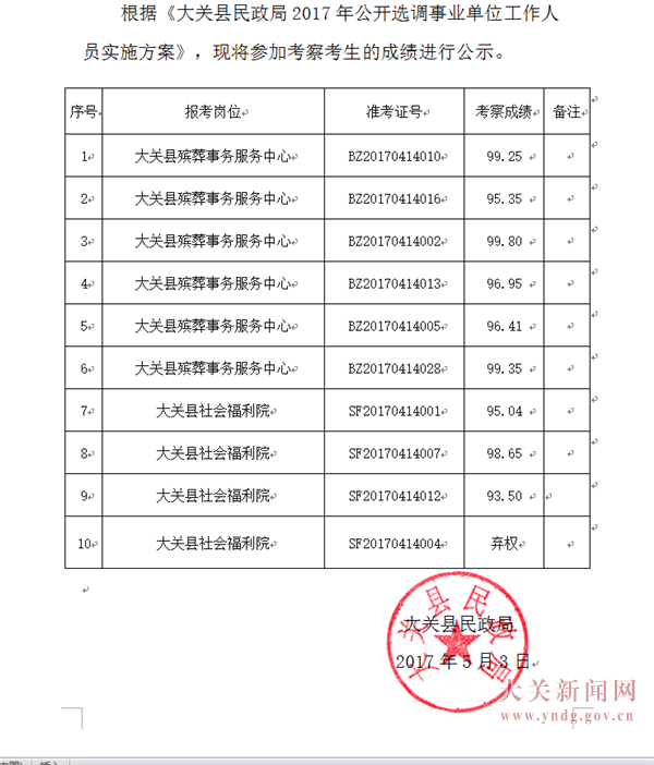 大關縣民政局2017年公開選調事業(yè)單位工作人員考察成績公示