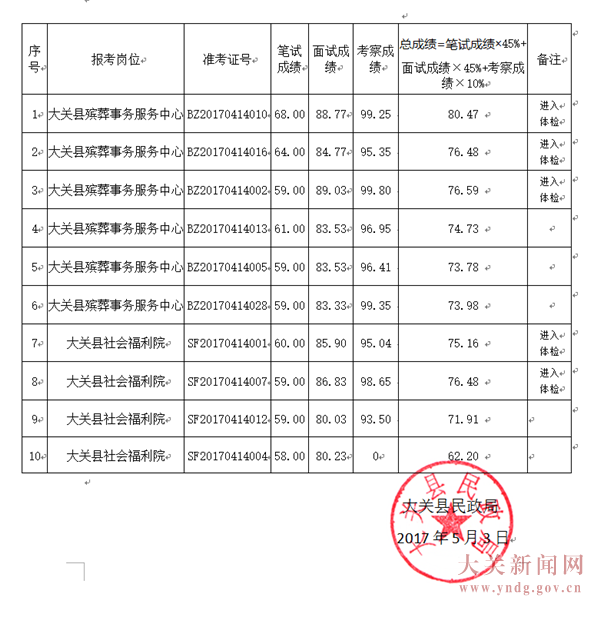 根據(jù)《大關(guān)縣民政局2017年公開(kāi)選調(diào)事業(yè)單位工作人員實(shí)施方案》,現(xiàn)將參加選調(diào)考生的最終總成績(jī)進(jìn)行公示。