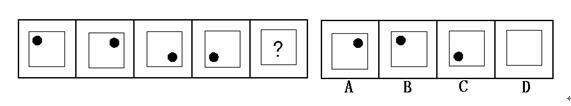 (答案:B。黑點在正方形中順時針移動。在第5個圖形中,應(yīng)該正好移動到左上角。)