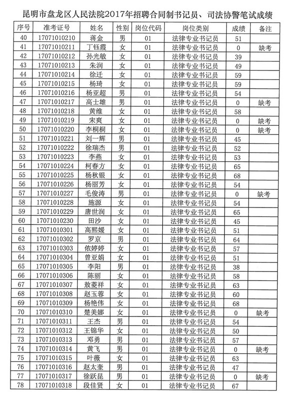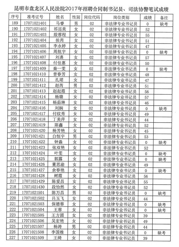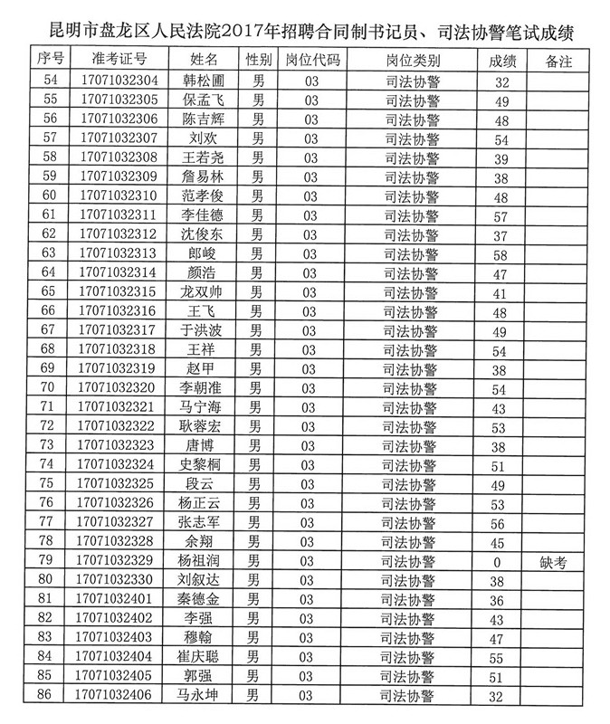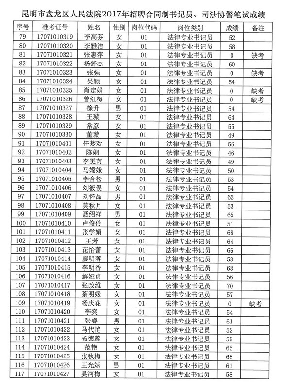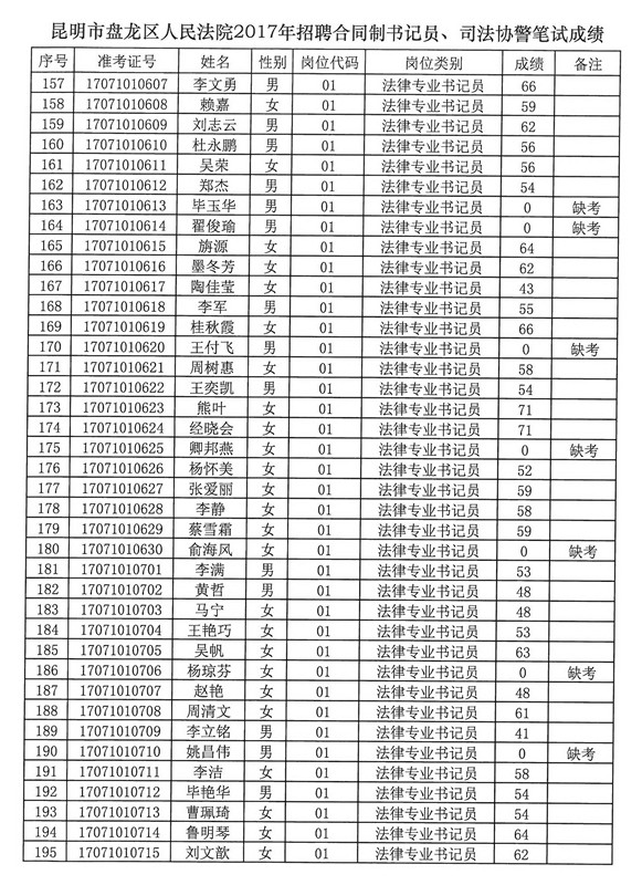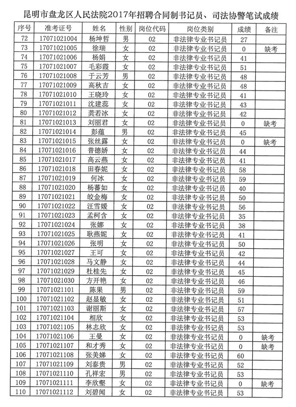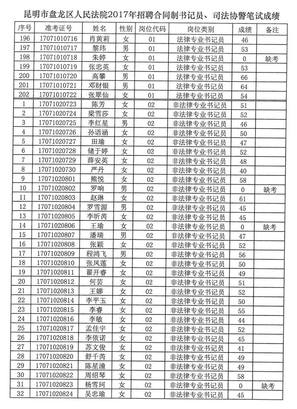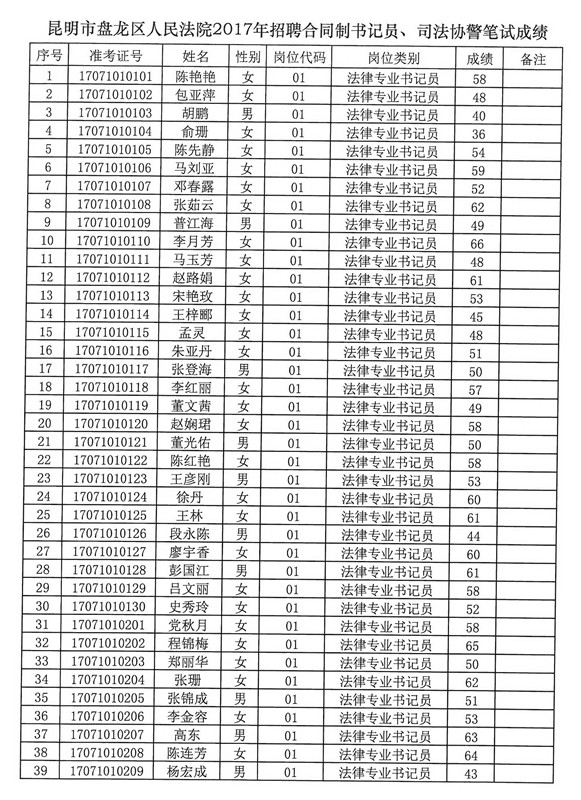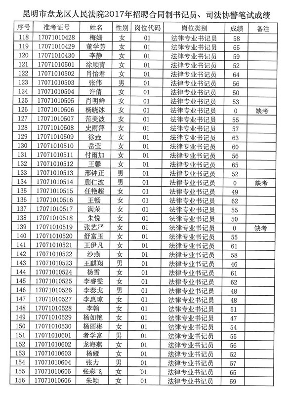 現(xiàn)將昆明市盤龍區(qū)人民法院2017年招聘合同制書記員、合同制司法協(xié)警筆試成績(附后)予以公示。若考生對筆試成績有異議,請持準(zhǔn)考證、身份證在公示期內(nèi)向招聘單位提出復(fù)查申請。