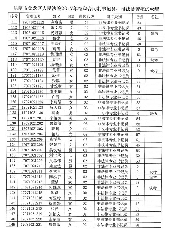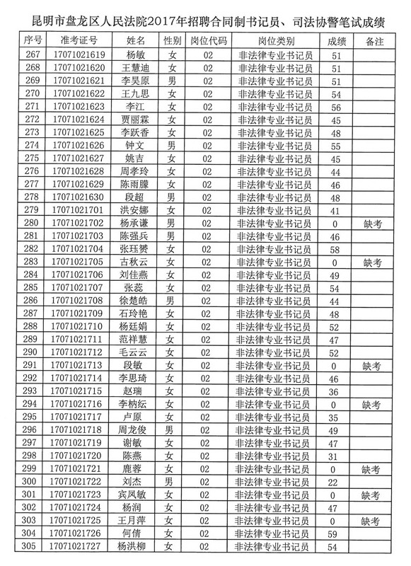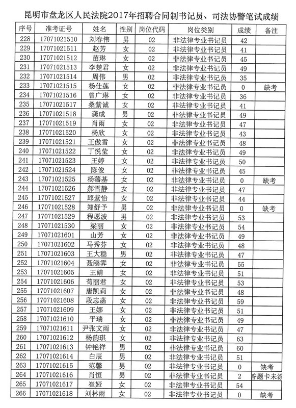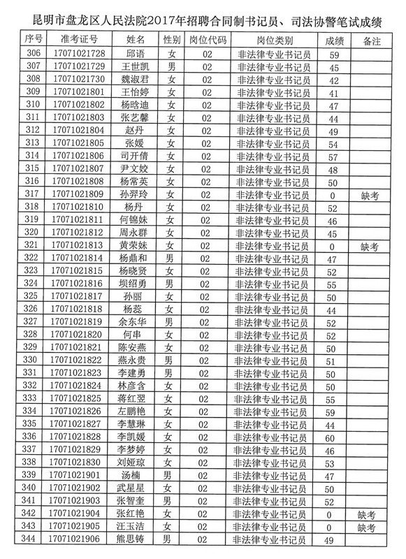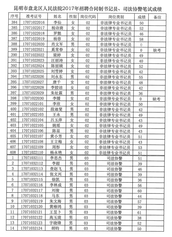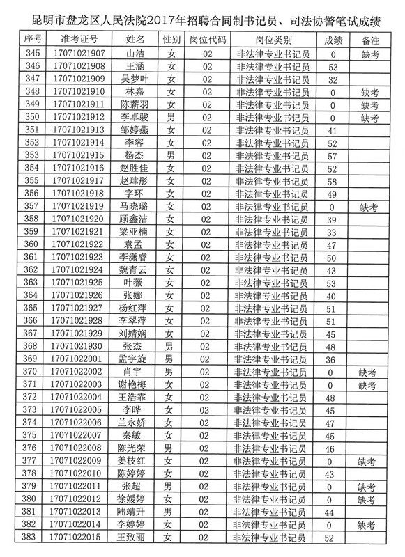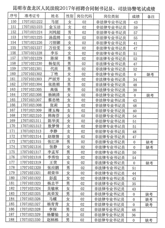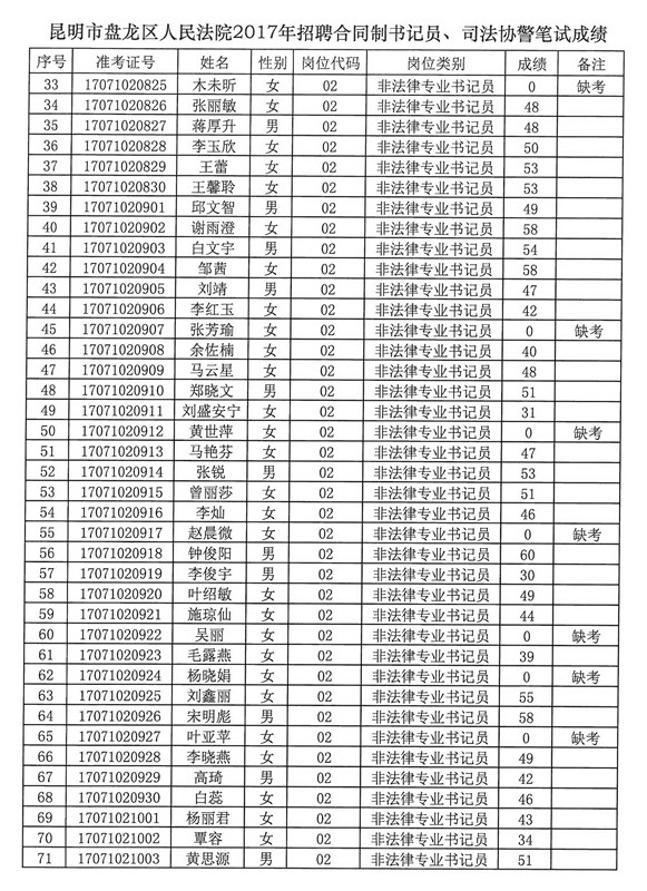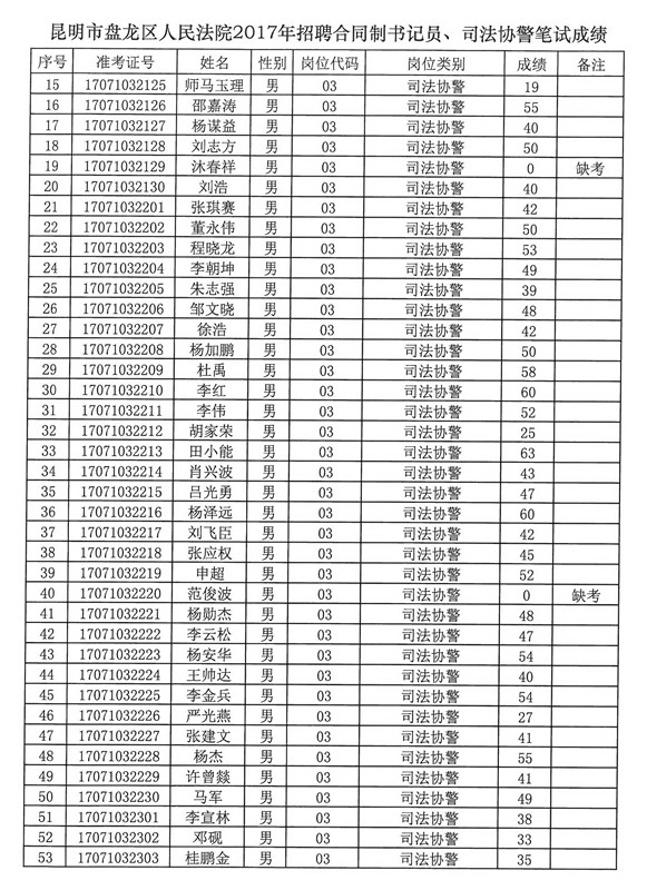 現(xiàn)將昆明市盤龍區(qū)人民法院2017年招聘合同制書記員、合同制司法協(xié)警筆試成績(附后)予以公示。若考生對筆試成績有異議,請持準(zhǔn)考證、身份證在公示期內(nèi)向招聘單位提出復(fù)查申請。