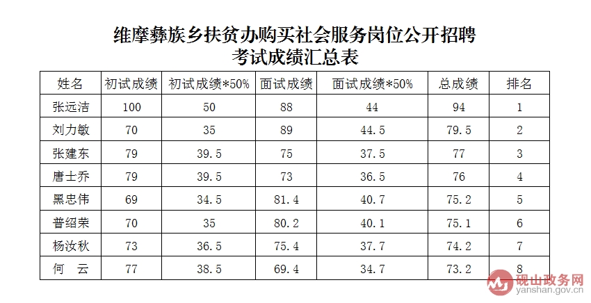 維摩彝族鄉(xiāng)扶貧辦購買社會(huì)服務(wù)崗位人員面試已于2017年5月19日結(jié)束,根據(jù)招聘程序,現(xiàn)將面試成績、總成績公告如下: