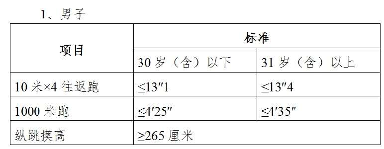 體能測評按照公安部《關(guān)于印發(fā)公安機(jī)關(guān)錄用人民警察體能測評項(xiàng)目和標(biāo)準(zhǔn)(暫行)的通知》及其所附標(biāo)準(zhǔn)開展。