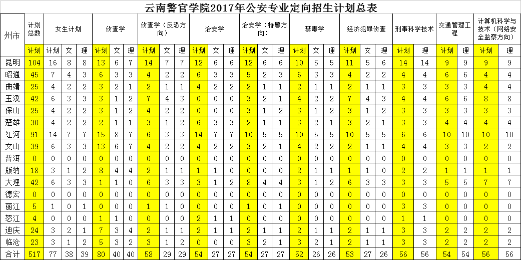 云南警官學(xué)院2017年公安專業(yè)定向招生計劃總表