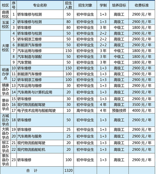 云南交通技師學院2017年繼續(xù)教育專、本科招生計劃表