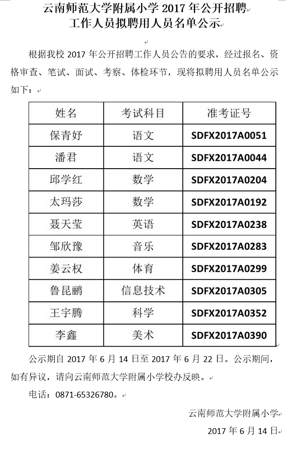 云南師范大學(xué)附屬小學(xué)2017年招聘人員擬聘用人員名單公示