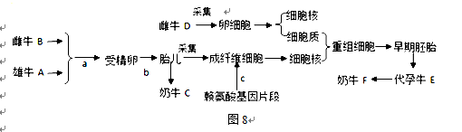 30. 圖8是吉林大學(xué)農(nóng)學(xué)院奶牛繁育基地成功培育攜帶外源賴氨酸基因的克隆奶牛的過程示意圖,請據(jù)圖回答(1)~(5)。