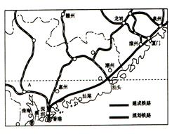 福建省委、省政府提出“建設海峽西岸經(jīng)濟區(qū)”這一戰(zhàn)略構想,中心目標就是發(fā)展福建經(jīng)濟,在一個更大的范圍內進行生產(chǎn)結構和資源配置,為全面實現(xiàn)兩岸“三通”,建設臺灣海峽經(jīng)濟圈奠定基礎。圖11是廈深鐵路示意圖,讀圖回答第28~29小題。