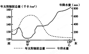 圖2為沿第二亞歐大陸橋中國段的年降水量和年太陽輻射總量分布圖,讀圖回答第4~5小題。