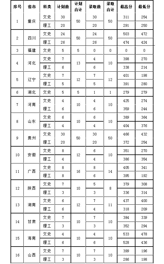 批次 | 學(xué)制 | 專業(yè)名稱 | 計(jì)劃數(shù) | 錄取數(shù) | 最高分 | 最低分 |