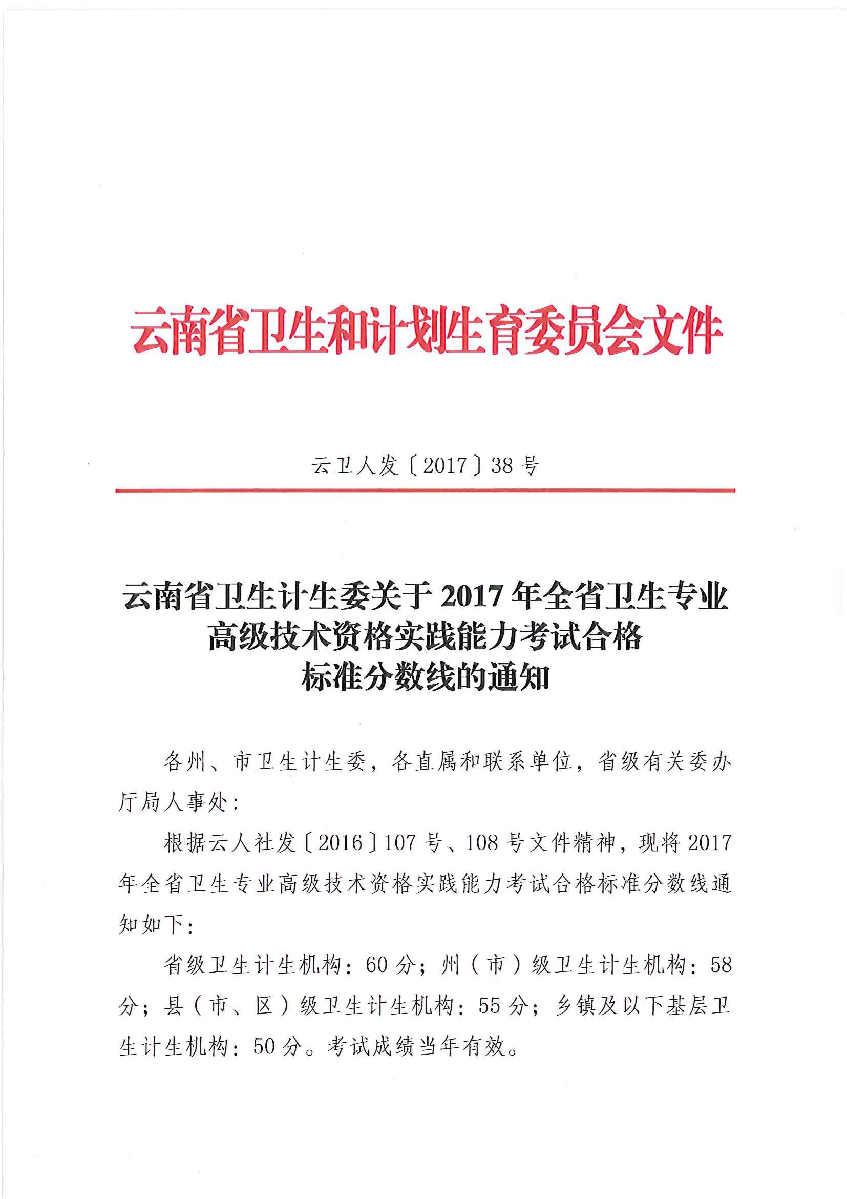 云南省2017年衛(wèi)生專業(yè)高級技術(shù)資格實踐能力考試合格標(biāo)準(zhǔn)通知