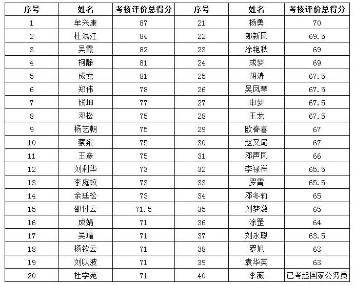 根據(jù)市委組織部《關(guān)于做好從優(yōu)秀村(社區(qū))干部中考試錄用鄉(xiāng)鎮(zhèn)(街道)公務(wù)員考核評價工作的通知(昭組通〔2017〕36號)要求,對報考鄉(xiāng)鎮(zhèn)(街道)公務(wù)員的大學生村官在面試前需進行考核評價。我縣嚴格按照《云南省從優(yōu)秀村(社區(qū))干部中考試錄用鄉(xiāng)鎮(zhèn)(街道)公務(wù)員考核評價評分標準》對大學生村官進行了量化評分,現(xiàn)將考核評價分數(shù)進行公示,公示時間為5天,如有疑問,請向縣委組織部大學生村官管理股反映。
