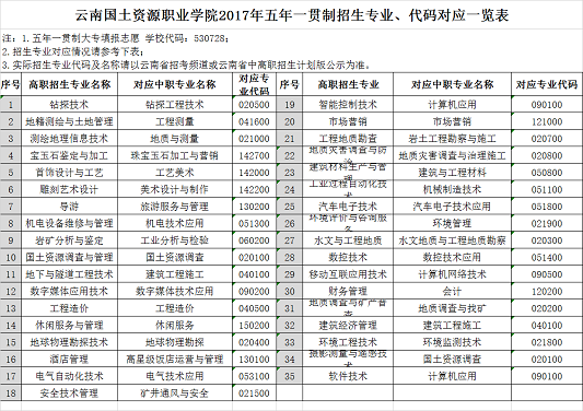 云南國土資源職業(yè)學院2017年五年一貫制招生專業(yè)、代碼對應一覽表