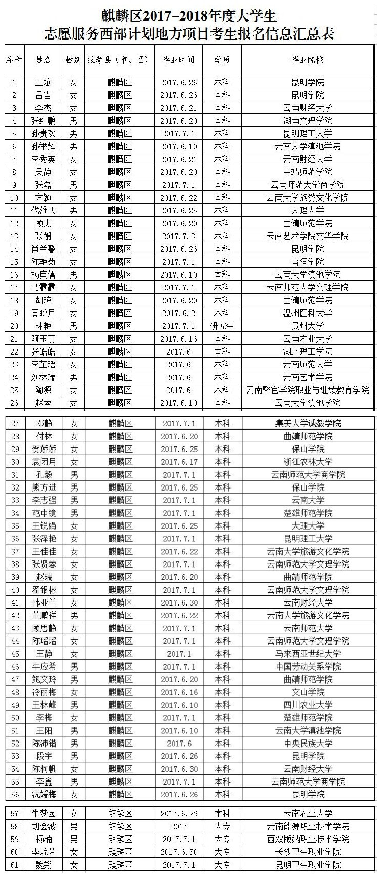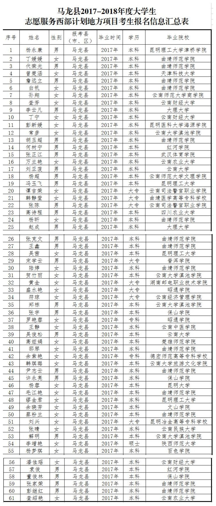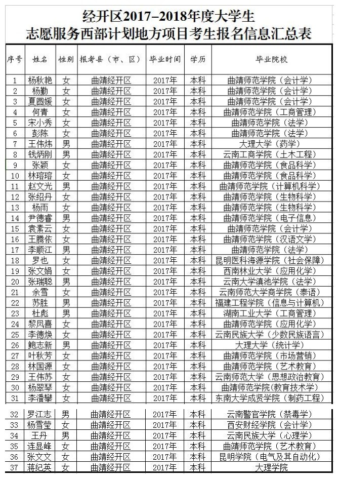 附件:曲靖市2017-2018年度大學(xué)生西部計劃地方項目考生筆試詳細(xì)名單
