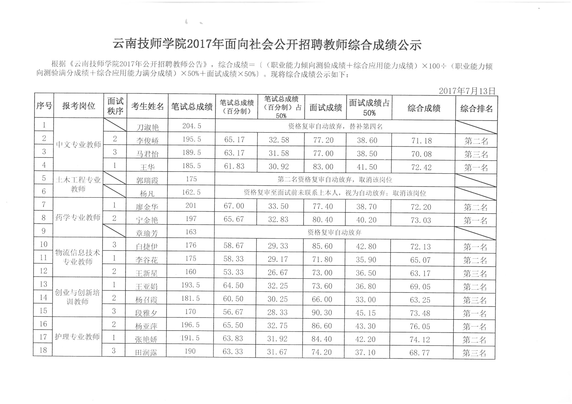云南技師學(xué)院2017年招聘教師綜合成績公示