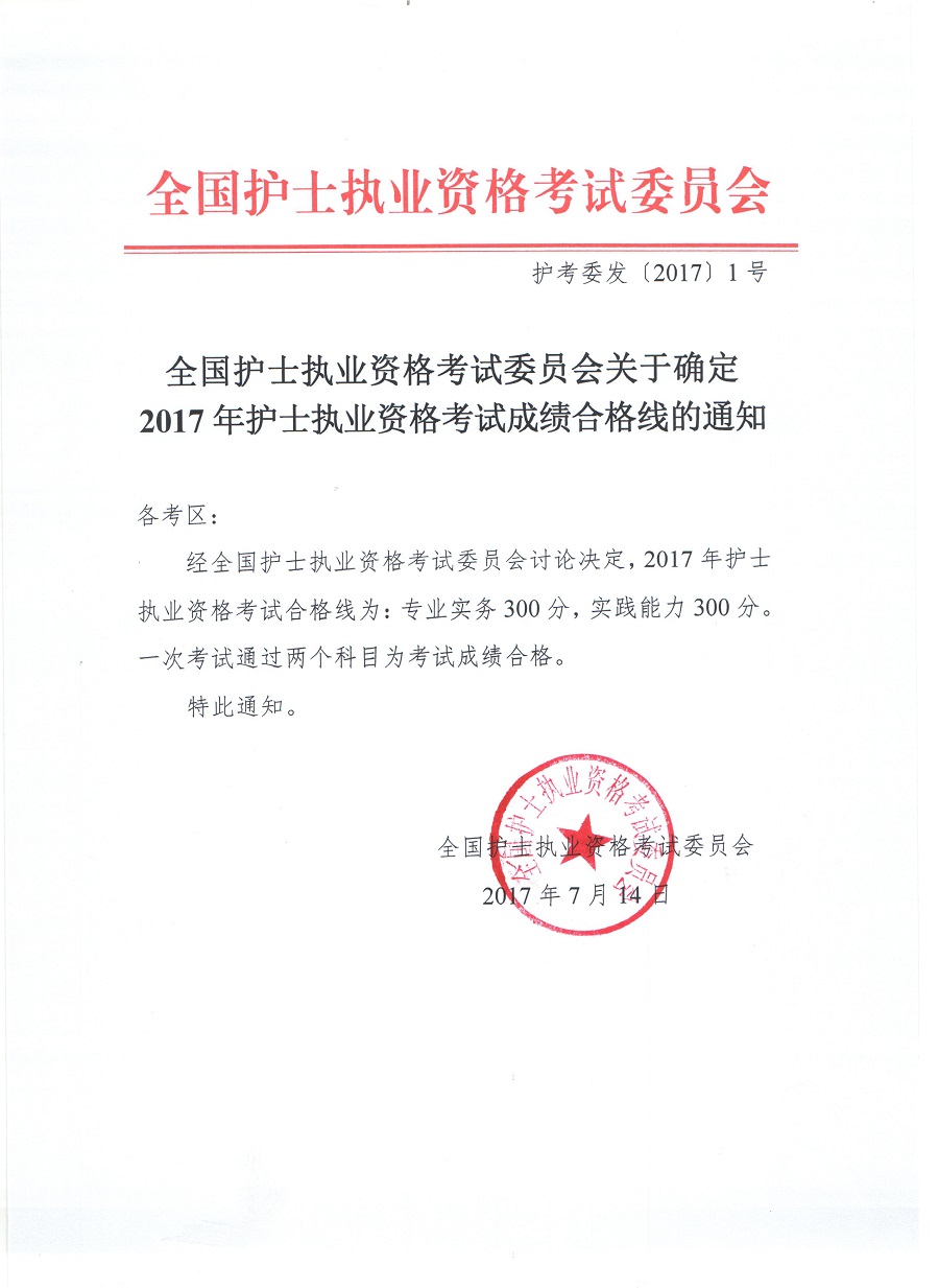 2017年全國護士執(zhí)業(yè)資格考試成績合格標(biāo)準(zhǔn)通知