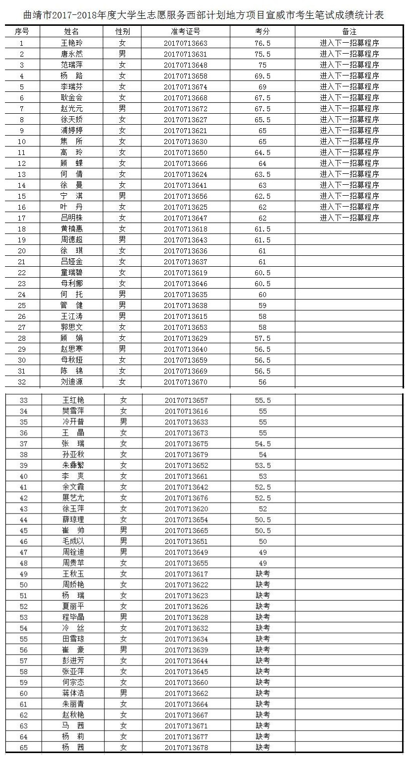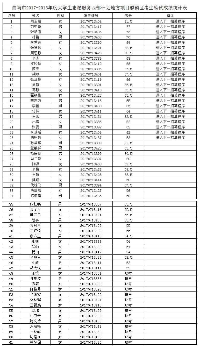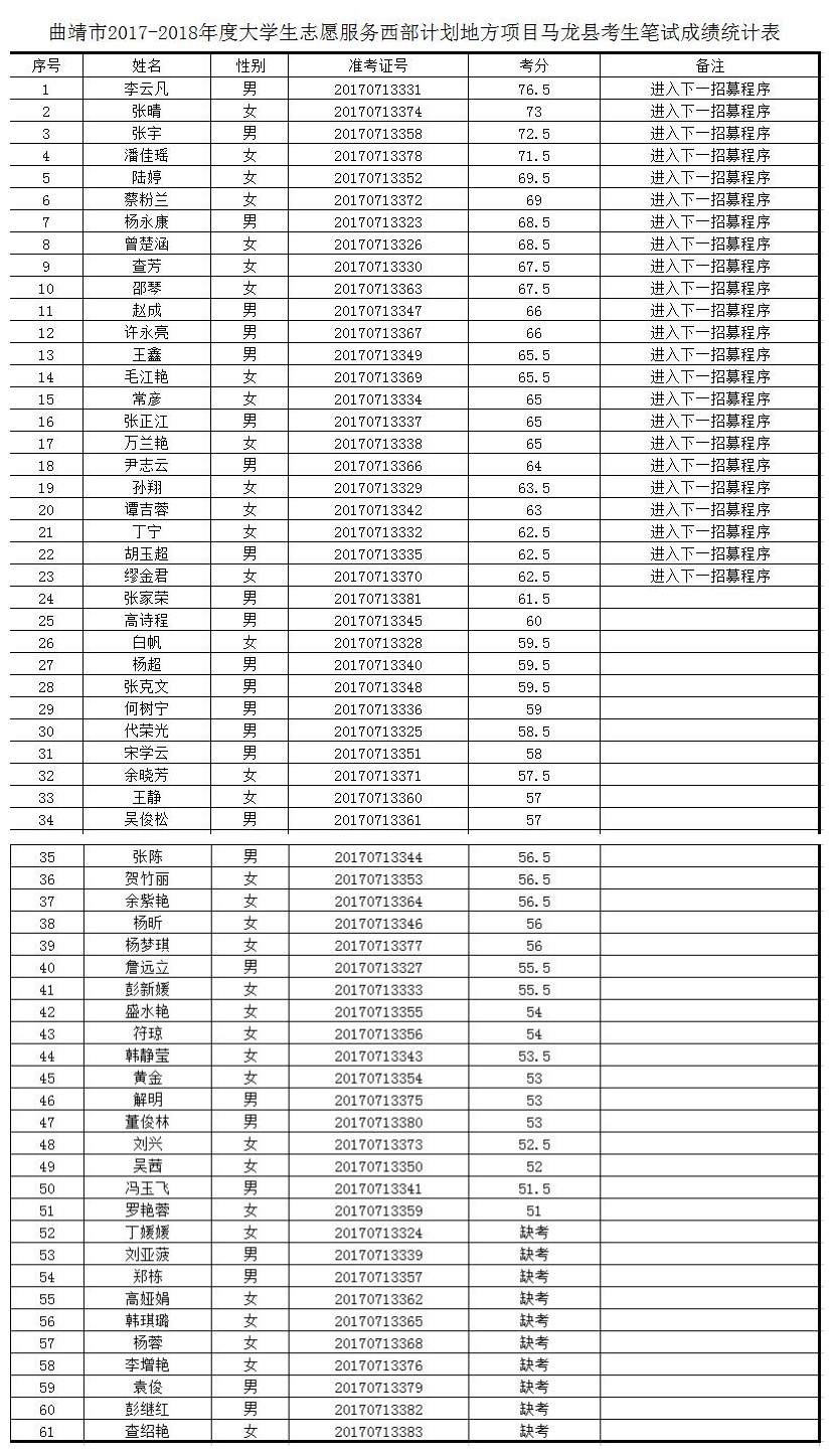 根據(jù)曲靖市2017-2018年度大學(xué)生志愿服務(wù)西部計劃省級地方項目志愿者招募程序, 此次招考共801人報名參加,其中應(yīng)考678人,缺考123人。曲靖市2017—2018年度大學(xué)生志愿服務(wù)西部計劃省級地方項目招募名額為100名,其中:麒麟?yún)^(qū)10人,宣威市8人,沾益區(qū)11人,馬龍縣11人,陸良縣10人,師宗縣10人,富源縣11人,羅平縣7人,會澤縣12人,經(jīng)開區(qū)10人。本次筆試成績根據(jù)招募崗位(以縣〈市〉為單位)1︰2的比例,按照筆試成績從高到低確定進入下一招募程序名單。現(xiàn)將志愿者招募筆試成績公告如下。