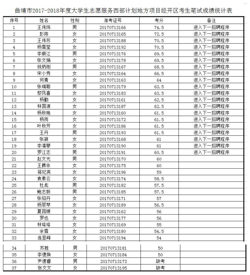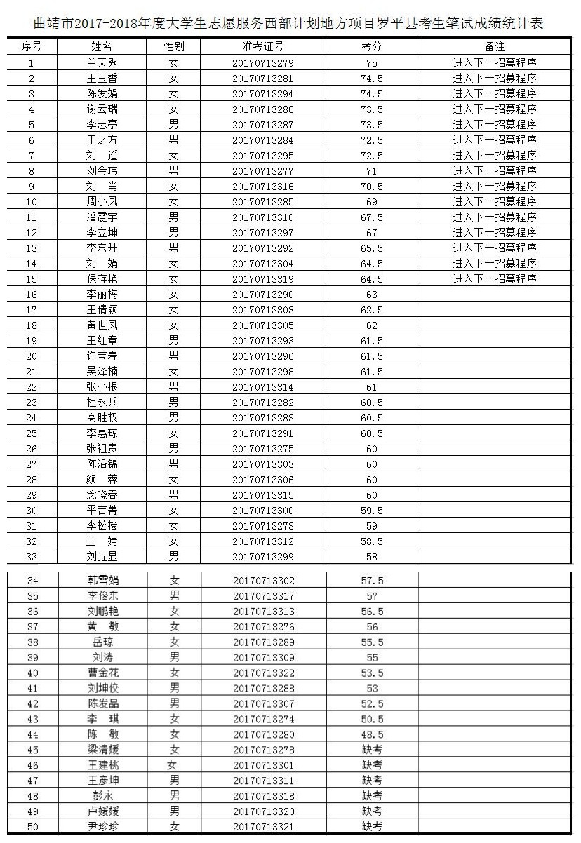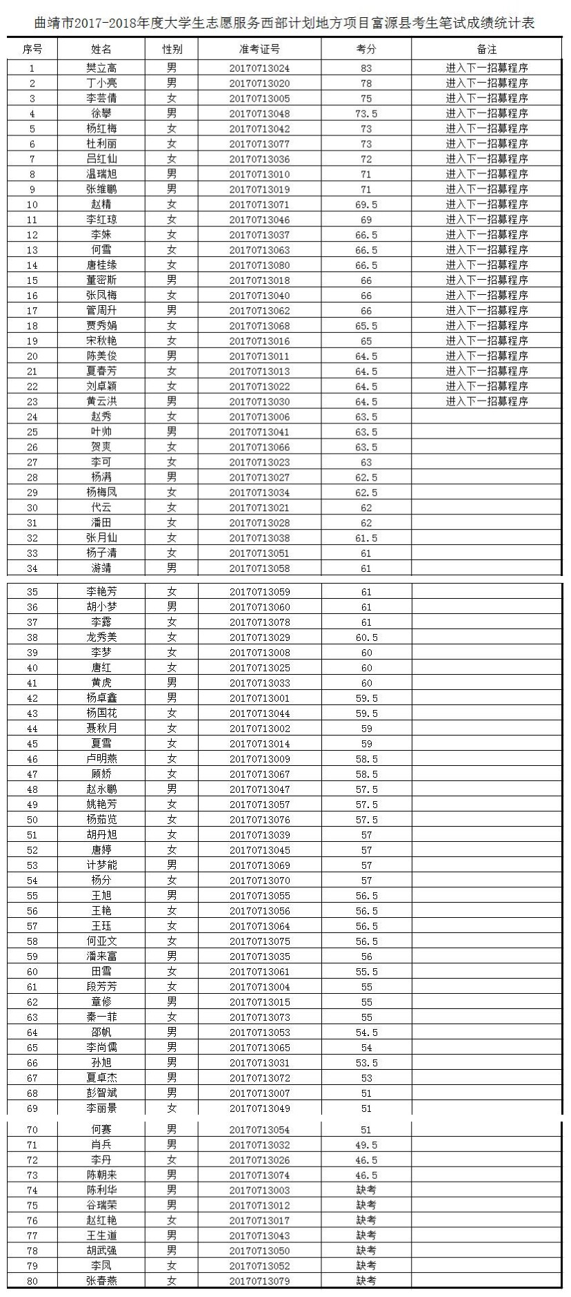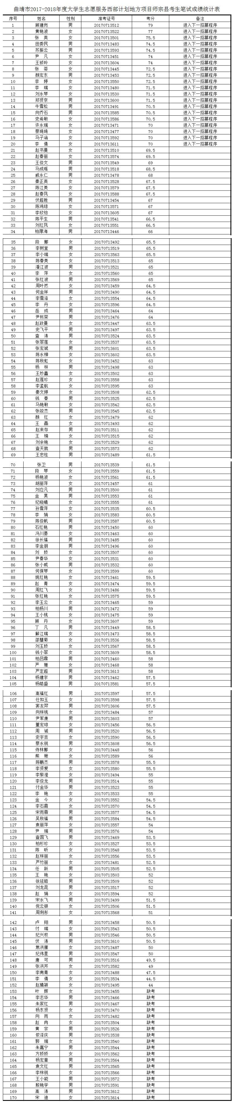 根據(jù)曲靖市2017-2018年度大學(xué)生志愿服務(wù)西部計劃省級地方項目志愿者招募程序, 此次招考共801人報名參加,其中應(yīng)考678人,缺考123人。曲靖市2017—2018年度大學(xué)生志愿服務(wù)西部計劃省級地方項目招募名額為100名,其中:麒麟?yún)^(qū)10人,宣威市8人,沾益區(qū)11人,馬龍縣11人,陸良縣10人,師宗縣10人,富源縣11人,羅平縣7人,會澤縣12人,經(jīng)開區(qū)10人。本次筆試成績根據(jù)招募崗位(以縣〈市〉為單位)1︰2的比例,按照筆試成績從高到低確定進入下一招募程序名單。現(xiàn)將志愿者招募筆試成績公告如下。
