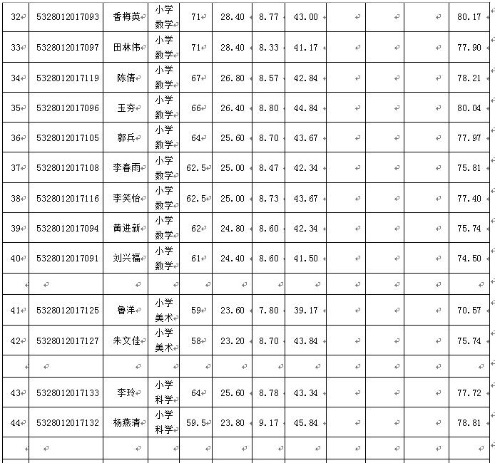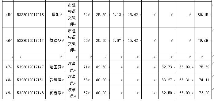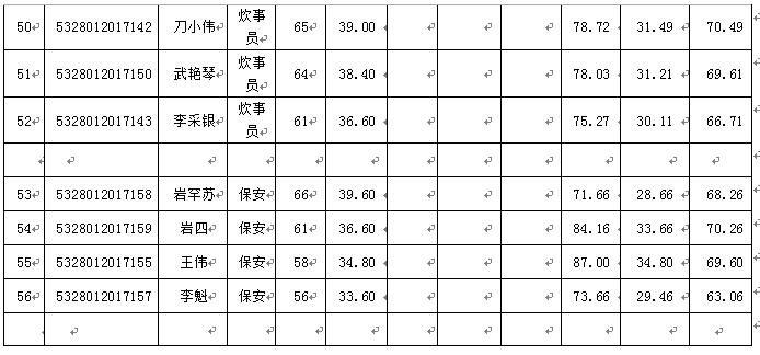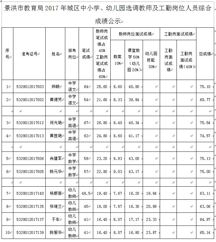 根據(jù)《景洪市教育局2017年城區(qū)中小學(xué)、幼兒園公開(kāi)選調(diào)教師及工勤崗位人員實(shí)施方案》,景洪市教育局通過(guò)組織筆試、面試,現(xiàn)將綜合成績(jī)公示如下: