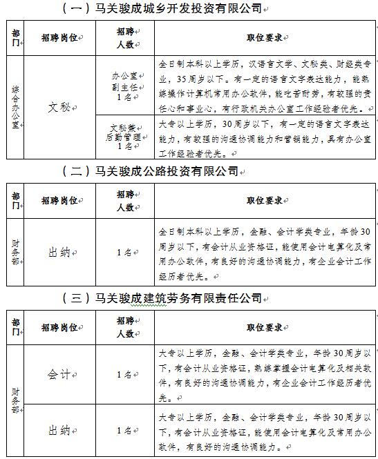 馬關(guān)駿成城鄉(xiāng)開發(fā)投資有限公司成立于2016年2月,是經(jīng)馬關(guān)縣人民政府批準(zhǔn),由縣財政局(國資局)按《公司法》出資組建的國有獨資公司,公司注冊資本金1億元。公司經(jīng)營范圍:對縣人民政府授權(quán)的國有資產(chǎn)進(jìn)行經(jīng)營管理;對城鄉(xiāng)基礎(chǔ)設(shè)施項目及交通、水利和市政工程進(jìn)行投資、項目建設(shè)、項目代建和項目管理;旅游基礎(chǔ)設(shè)施、旅游重點項目、旅游精品工程及相關(guān)配套產(chǎn)業(yè)、產(chǎn)品的投資、開發(fā)和經(jīng)營管理;憑資質(zhì)參與其他開發(fā)和投資經(jīng)營(房地產(chǎn)、工程建筑施工、供排水和土地開發(fā)整理等)。公司擁有云南鑫沛建筑工程有限公司、馬關(guān)駿成城投房地產(chǎn)開發(fā)有限公司、馬關(guān)駿成建筑勞務(wù)有限責(zé)任公司、馬關(guān)駿成公路投資有限公司和馬關(guān)南山園區(qū)綜合開發(fā)有限公司五家全資子公司,現(xiàn)因業(yè)務(wù)發(fā)展需要,特面向社會公開招聘工作人員。