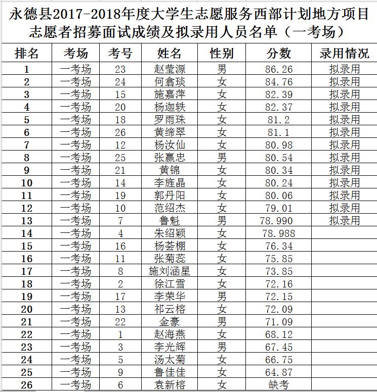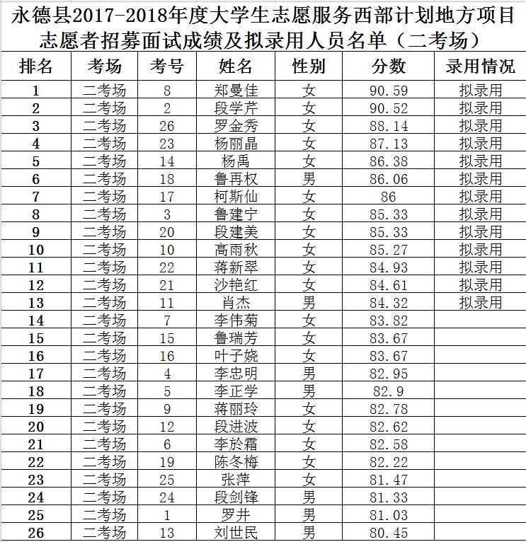 說明:1.本次面試按筆試成績(jī)排名單雙號(hào)分兩個(gè)考場(chǎng)進(jìn)行,每個(gè)考場(chǎng)按面試成績(jī)排名擬錄用前13名,擬錄用人員請(qǐng)保持電話暢通,等候體檢通知;2.本次考試由永德縣紀(jì)委第一紀(jì)工委全程監(jiān)督,監(jiān)督舉報(bào)電話:13988388080(禹偉彬永德縣紀(jì)委第一紀(jì)工委副書記)。
