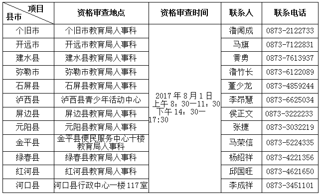 紅河州2017年特崗教師招聘現(xiàn)場資格審查時間為2017年8月1日,上午8:30—11:30;下午14:30—17:30。資格審查地點:12個設(shè)崗縣市教育局(見下表):