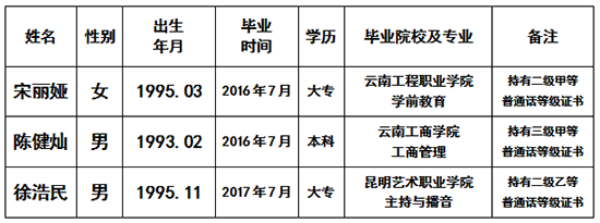 根據(jù)《2017年鎮(zhèn)沅廣播電視臺(tái)公開(kāi)招聘合同制記者公告》,經(jīng)發(fā)布招聘公告、公開(kāi)報(bào)名、資格審查、面試、筆試等招聘程序,按照考試綜合成績(jī)從高分到低分的順序,擬聘用宋麗婭、陳健燦、徐浩民3位同志為鎮(zhèn)沅廣播電視臺(tái)合同制一線記者,現(xiàn)予以公示。