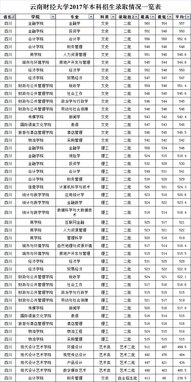 云南財經(jīng)大學(xué)2017年四川省錄取情況一覽表